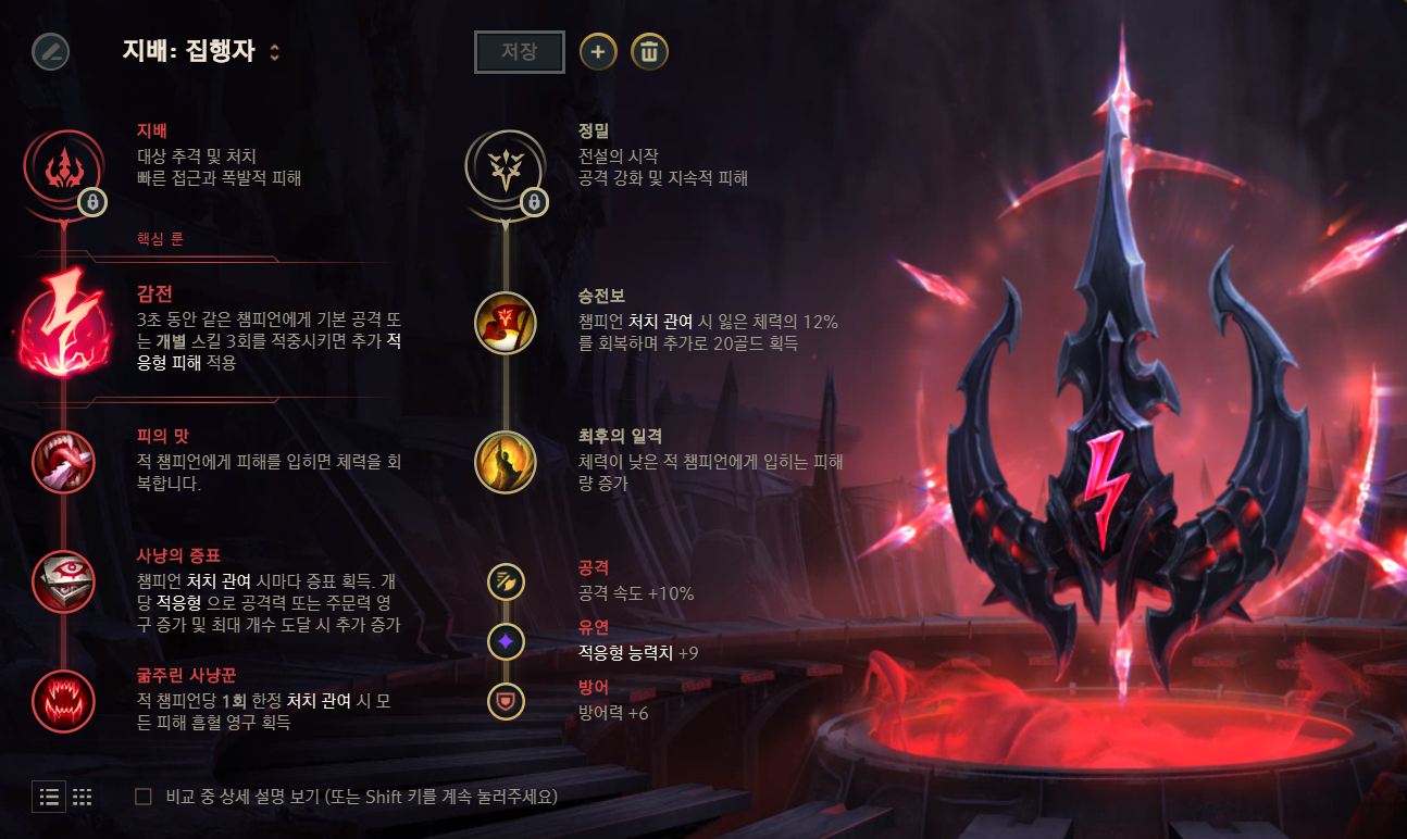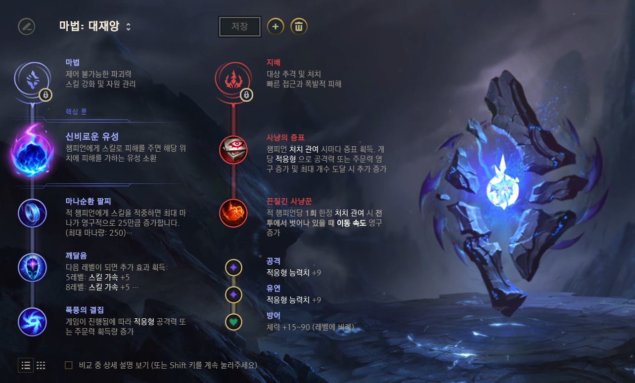 - 10. 방어력, 마법 저항력 룬 파편 혹은, 적응형 능력치 룬 파편 중 하나를 선택 가능합니다.