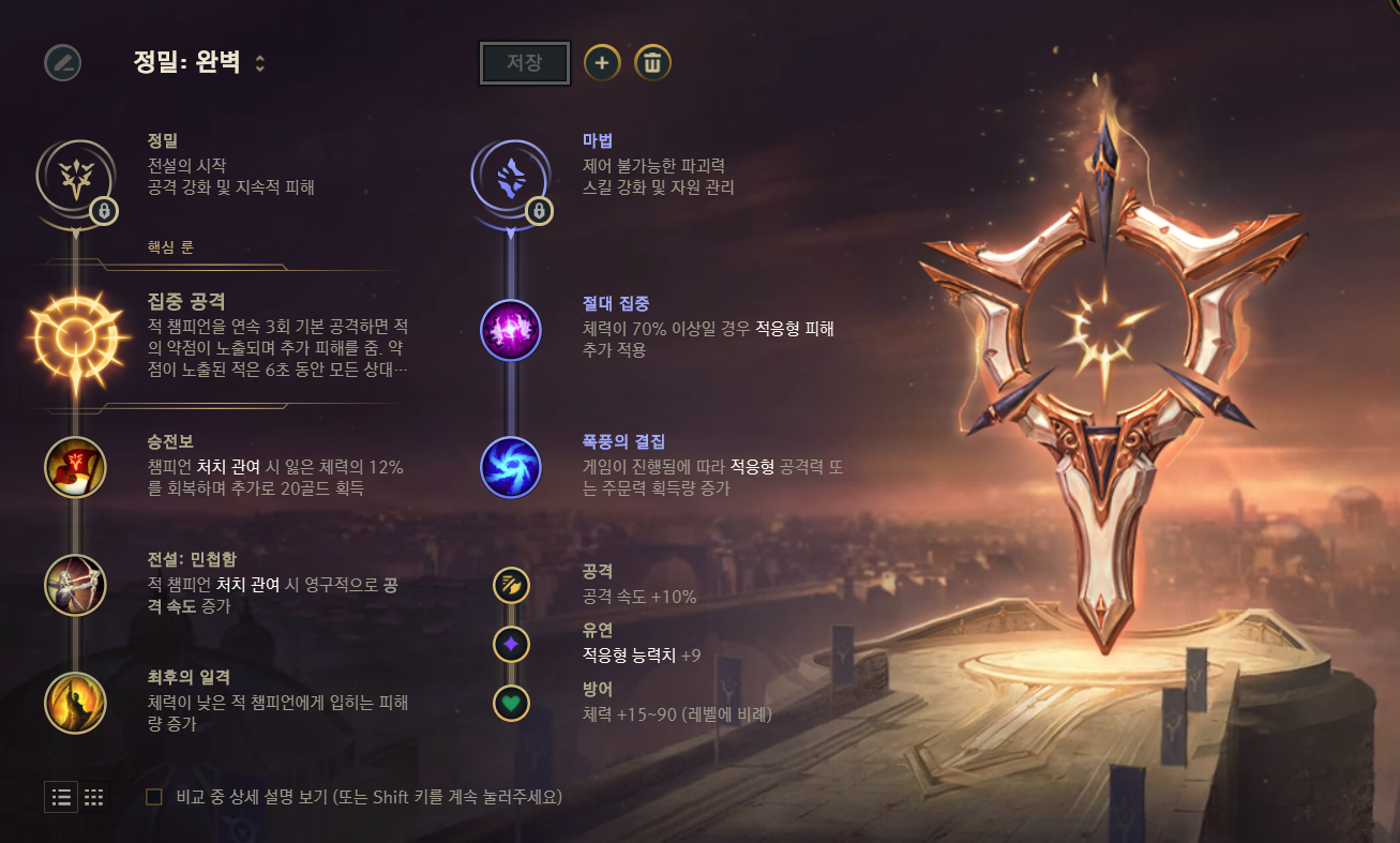 이 부분을 클릭하면 주요 룬 빌드가 정밀으로 바뀌게 됩니다. (순서대로 정밀, 지배, 마법, 결의, 영감)