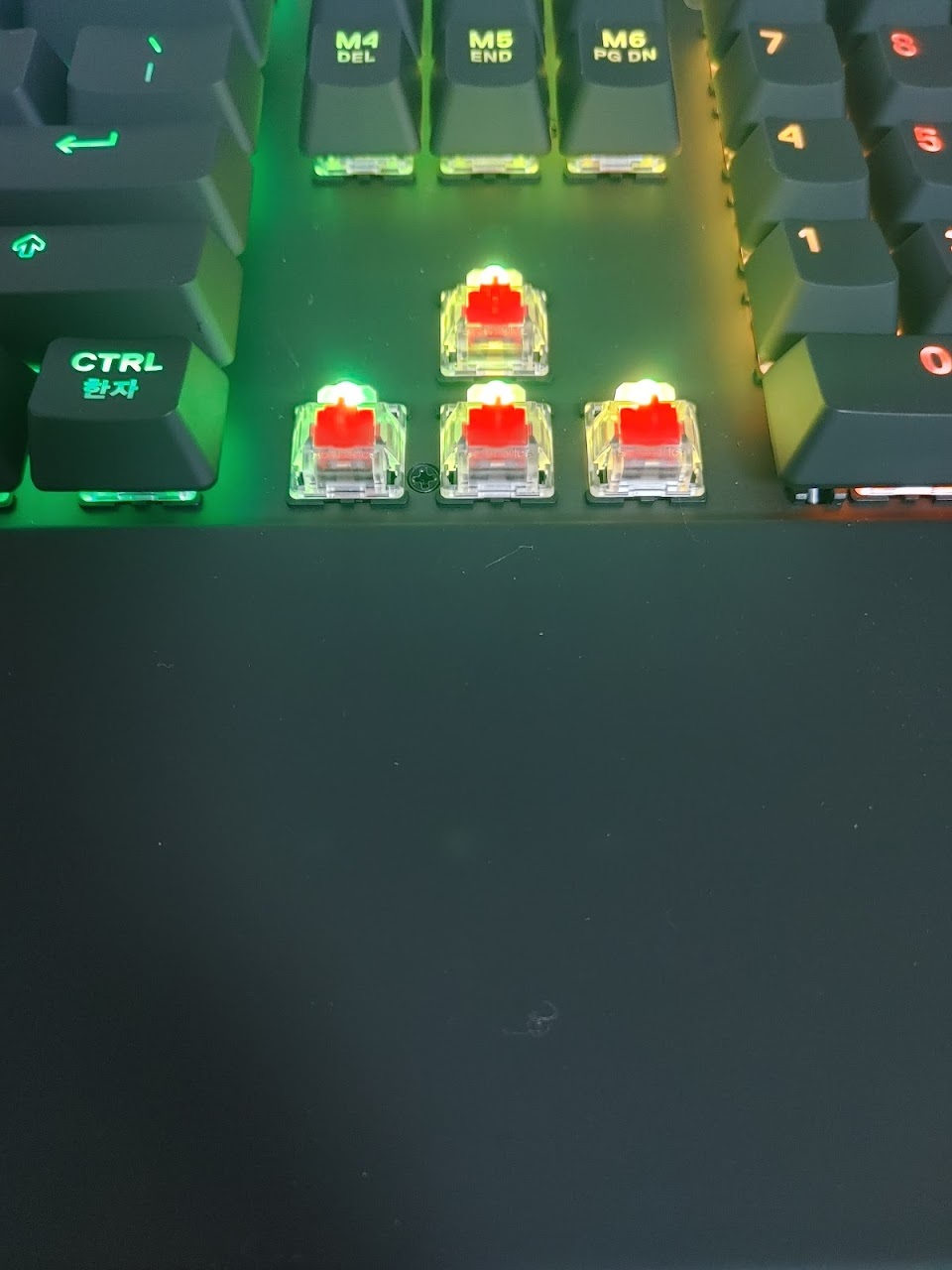 키감의 경우 적축 키보드를 오랜만에 사용해봐서 그런지 손에 익지는 않았습니다. 며칠 간 사용해본 결과 압력이 낮아 키보드를 사용하기 편했으며, 축에서 나는 잡 소음이나 스프링 소음 등 스위치 자체는 굉장히 잘 만들어졌으나 키캡과 부딪히면서 결과적으로 생각 이상으로 시끄러운 타건음을 들려주었습니다.