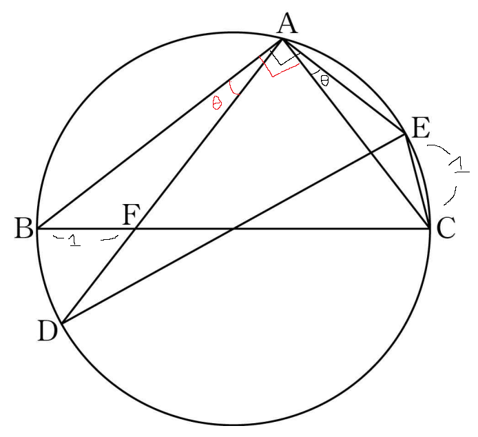 일단 BC가 지름이라고 했고, BC와 DE의 길이가 동일하다고 했으니 DE 역시 외접원의 지름이 되겠습니다. 지름과 지름이 만나는 교점은 중심이므로, DE와 BC의 교점은 외접원의 중심이 됩니다.