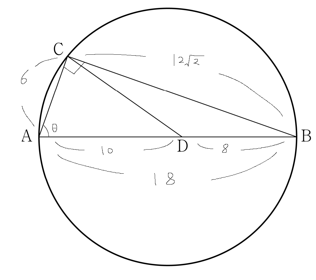 이제 삼각형 CAD의 두 변의 길이를 알고있고, cosθ 역시 알고 있으니 코사인법칙을 통해 CD의 길이를 구해내면 될 것 같네요.
