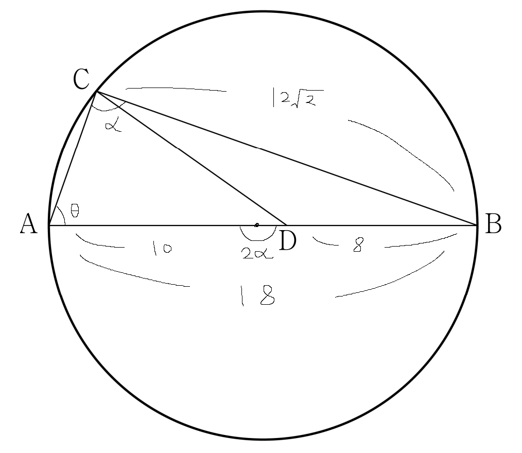 이제 원주각 C가 직각이라는 정보를 알아냈고 두 변의 길이를 이용해 피타고라스 정리를 사용하려 했는데 계산이 너무 귀찮지 않아요? 18을 제곱하고 12루트2도 제곱해야하고 그걸 더하고 빼고 다시 루트를 씌우고 어쩌고..