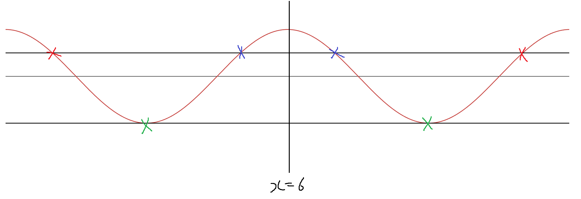 cos함수의 대칭 축을 이용하여 깔끔하게 교점의 합을 구해줍시다. 파란 교점끼리의 합, 초록 교점끼리의 합, 빨간 교점끼리의 합은 전부 12가 되므로, 12x3 = 36으로 아주 깔끔하고 쉽게 계산을 해 줄 수 있게 됩니다.