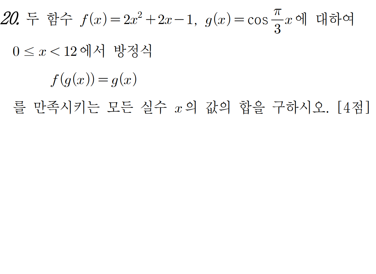 코사인함수와 다항함수를 합성한 함수와 코사인함수간의 교점을 구하는 문제입니다. 언뜻 보면 굉장히 풀이법이 복잡해보이지만, 합성함수의 특징을 잘 활용한다면 정말 별 것 아닌 문제였습니다.