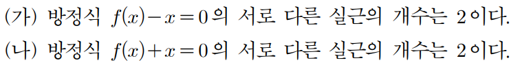 두 방정식의 서로 다른 실근의 개수가 2개입니다. 즉 f(x)와 x가 서로 다른 두 점에서 만나며, f(x)와 -x라는 그래프 역시 서로 다른 두 점에서 만난다는 의미입니다.