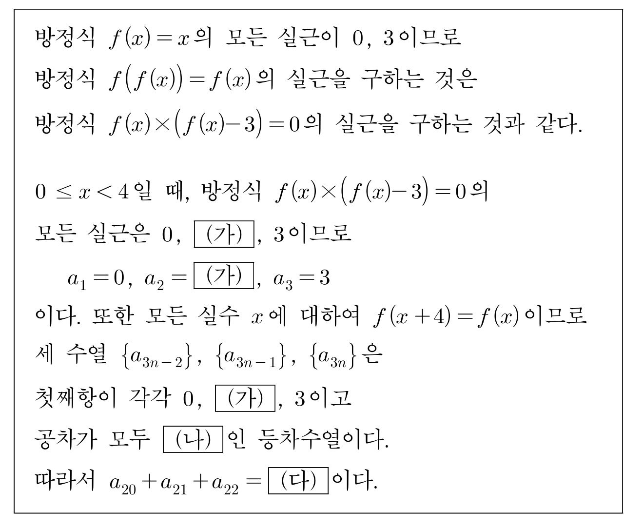 $f(x)=0$의 실근이 0,3 이므로 $f(x)-3=0$의 실근을 구해주면 (가)에 들어갈 실근이 되겠네요.