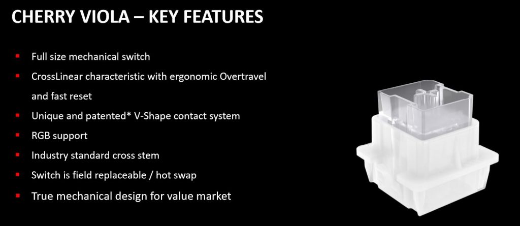 체리 社에서 직접 개발한 비올라 스위치입니다. 스위치 하우징이 하얀색으로 디자인 되있으며, 먼지를 막기 위한 방진벽 설계가 되어있는 모습입니다.