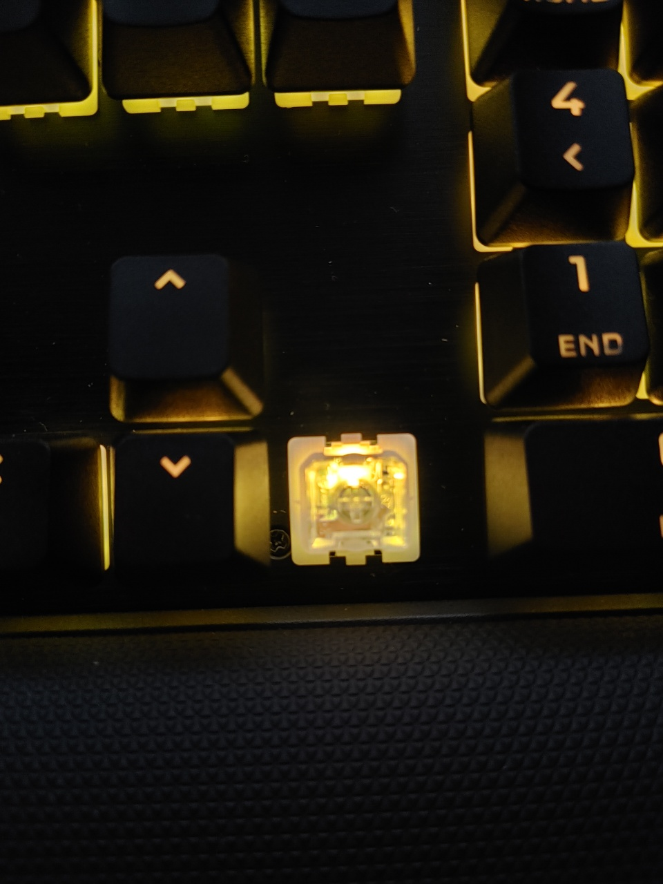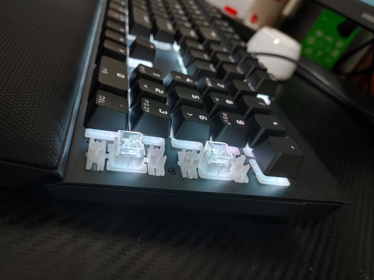 또한 스위치의 축 자체가 투명색 플라스틱을 이용하여 제작되었으며, LED 소자가 위에 위치해있는 기존 게이밍 키보드와는 달리, 약간은 가운데에 위치해있습니다.