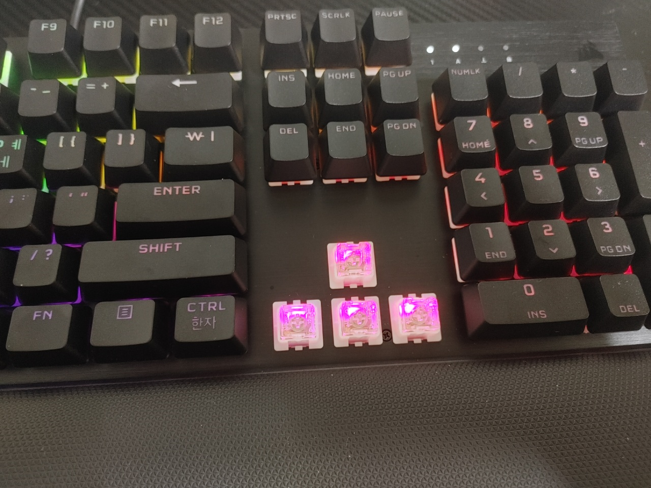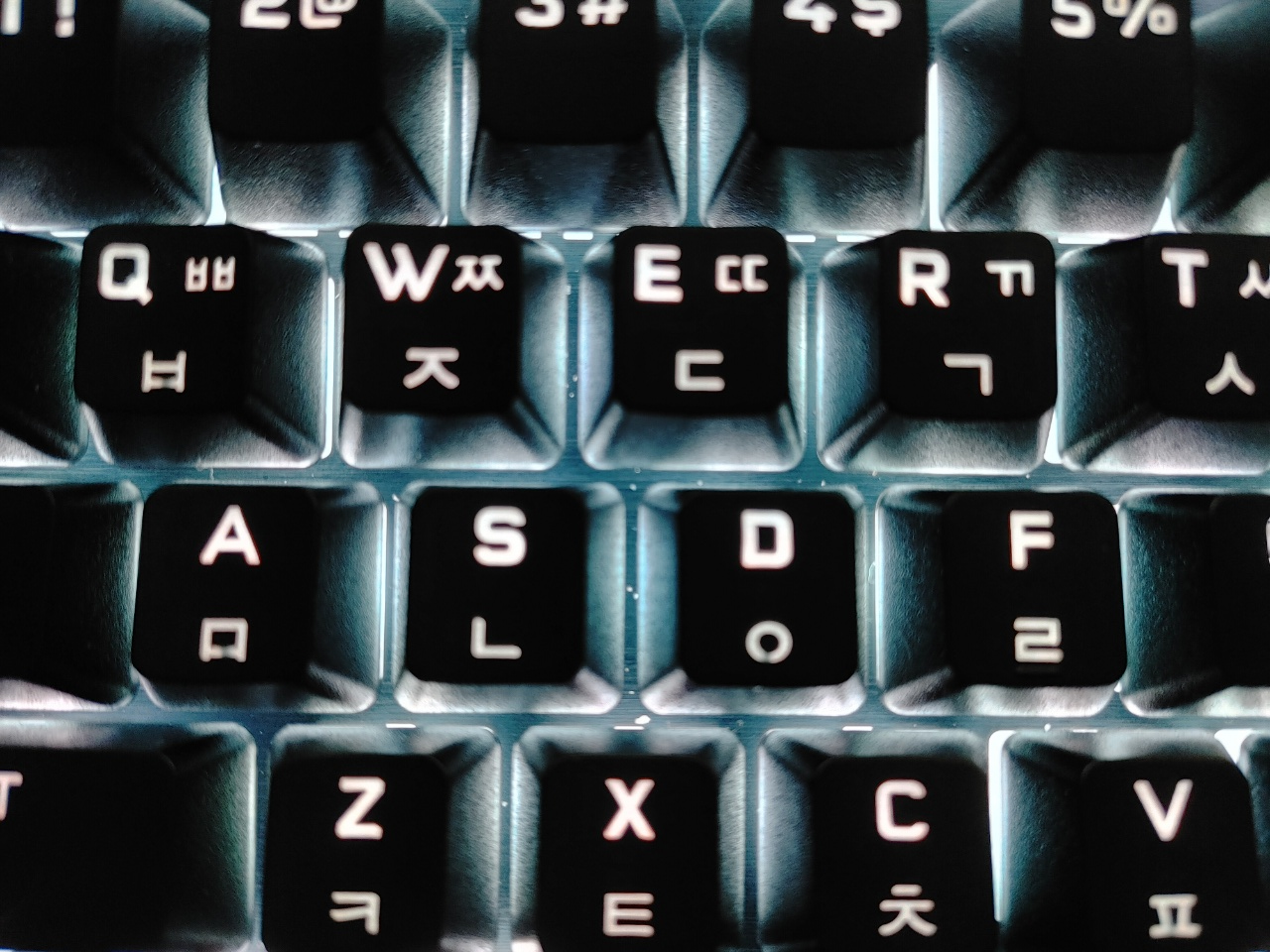 이렇게 한글 각인 부분까지 LED가 깔끔히 들어오는 이유는 바로 스위치에 있습니다. 추후 키캡 및 스위치, 스테빌라이저 편에서 설명해드리도록 하죠!