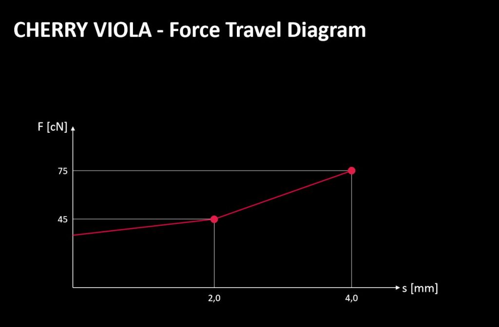 다만 체리 적축의 경우, 4.0mm 끝 까지 스위치를 눌렀을 때, 총 들어가는 힘은 60g인 반면에 체리 비올라 스위치는 75g의 힘이 들어갑니다. 즉, 작동점까지만 스위치를 눌렀을 때에는 체리 적축과 동일한 키압이지만 끝까지 눌렀을 경우 15g의 차이가 존재했습니다. 실제로도 키보드를 사용하면서, 스위치를 끝까지 누르면 키압이 무거워져, 자연스럽게 스위치를 작동점까지만 누르게 됩니다.